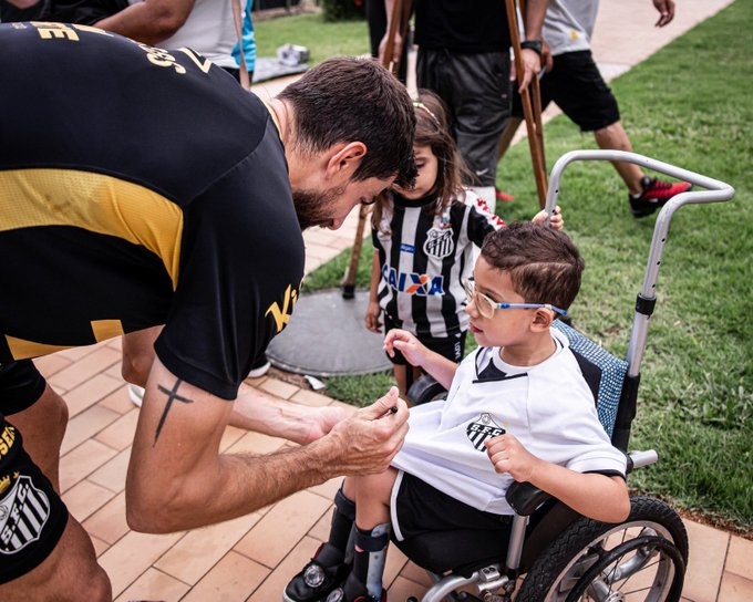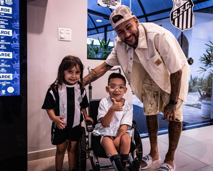 桑托斯小球迷莱维患有先天脊髓脊膜膨出症,这是一种罕见的疾病,莱维坚强地与病魔抗争,今日他受邀参观桑托斯训练中心,与球员们见面合影,并与自己的偶像内马尔互动,桑托斯社媒晒出相关照片。